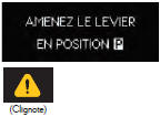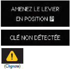 La clé à puce a été sortie du véhicule et la portière du conducteur a été ouverte, puis fermée, sans que le contacteur d'alimentation ait été désactivé, alors que vous étiez en position de changement de vitesse autre que P. → Passez en position de changement de vitesse P. → Rapportez la clé à puce dans le véhicule. |