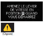| La clé à puce a été sortie du véhicule et la portière du conducteur a été ouverte, puis fermée, sans que le contacteur d'alimentation ait été désactivé, alors que vous étiez en position de changement de vitesse P. → Désactivez le contacteur d'alimentation. → Rapportez la clé à puce dans le véhicule. | |||