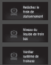 Vérifier le niveau du liquide de frein. Que faire lorsque le témoin s'allume S'allume en même temps que le témoin ABS - Faire vérifier le véhicule par un concessionnaire. Si le témoin du système de freinage (rouge) s'allume ou clignote Clignote et le témoin du système de freinage (ambre) s'allume en même temps Le système de frein de stationnement électrique est défectueux. Il se peut que le frein de stationnement ne soit pas engagé. Éviter d'utiliser le frein de stationnement et faire vérifier le véhicule immédiatement par un concessionnaire. Si le témoin du système de freinage (rouge) s'allume ou clignote en même temps que le témoin du système de freinage (ambre) s'allume |